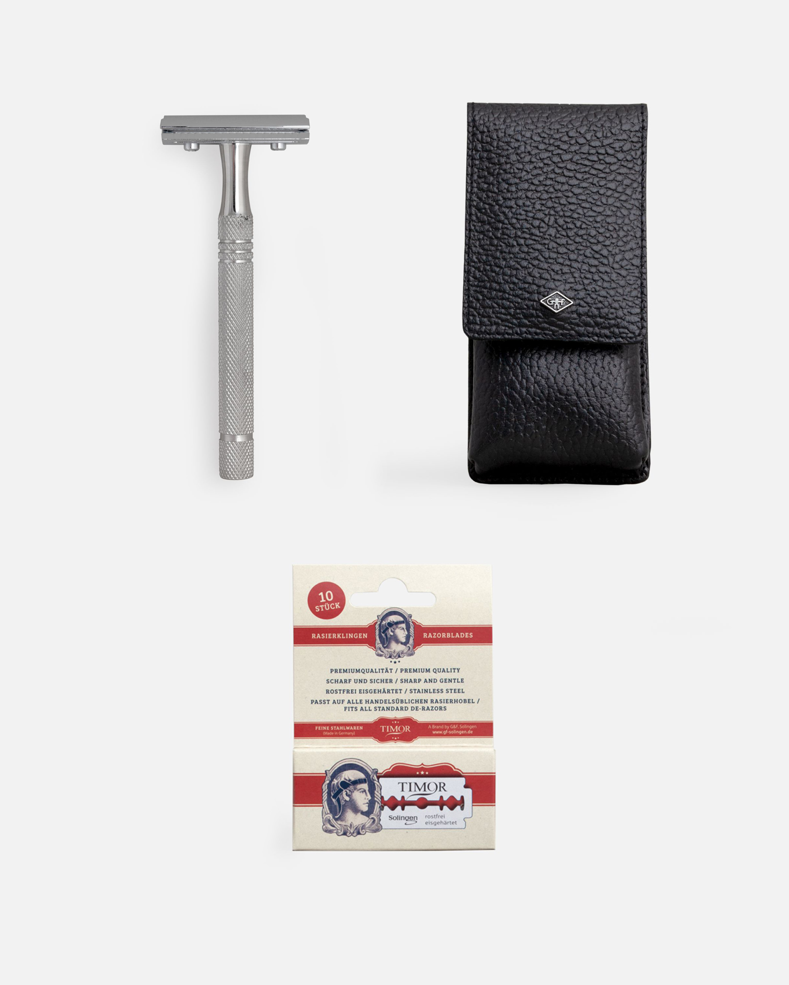 Ein tolles Einstiegsbundle in die Welt der Nassrasur für sie, für ihn, für alle. Unser G&F Timor® Unisex Gentle Shaver mit geschlossenem Kamm, inkl. 10 Timor® Rasierklingen und dem schicken schwarzen G&F Timor® Lederetui mit Einsteckfach auf der Rückseite für die Rasierklingen macht sich hervorragende unter jedem Weihnachtsbaum. Made in Germany, made by G&F.