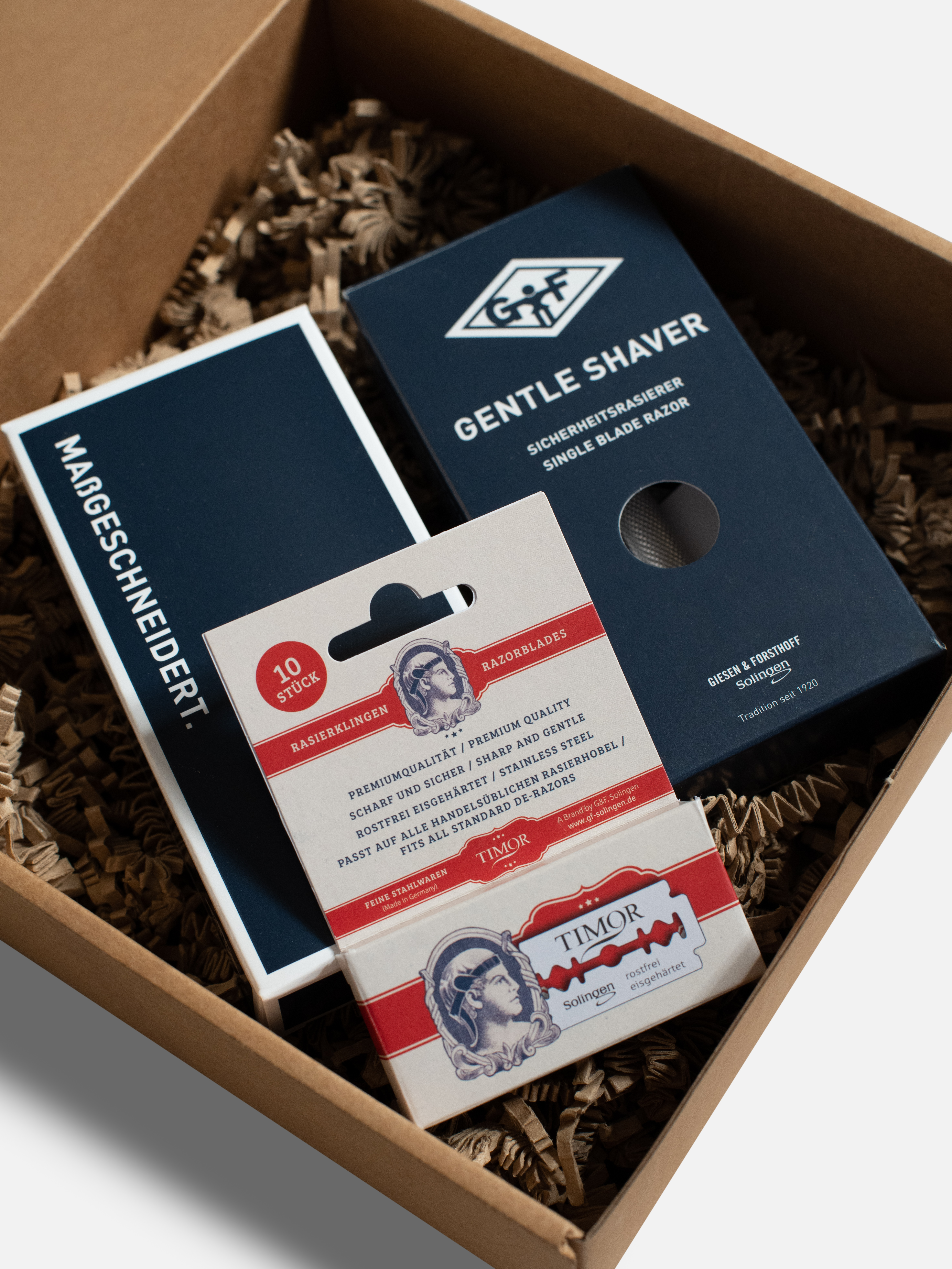 Ein tolles Einstiegsbundle in die Welt der Nassrasur für Sie, für Ihn, für Alle. Unser G&F Timor® Unisex Gentle Shaver mit geschlossenem Kamm, inkl. 10 Timor® Rasierklingen und praktischer Halterung für den Rasierer machen sich hervorragend unter jedem Weihnachtsbaum. Made in Germany, made by G&F.