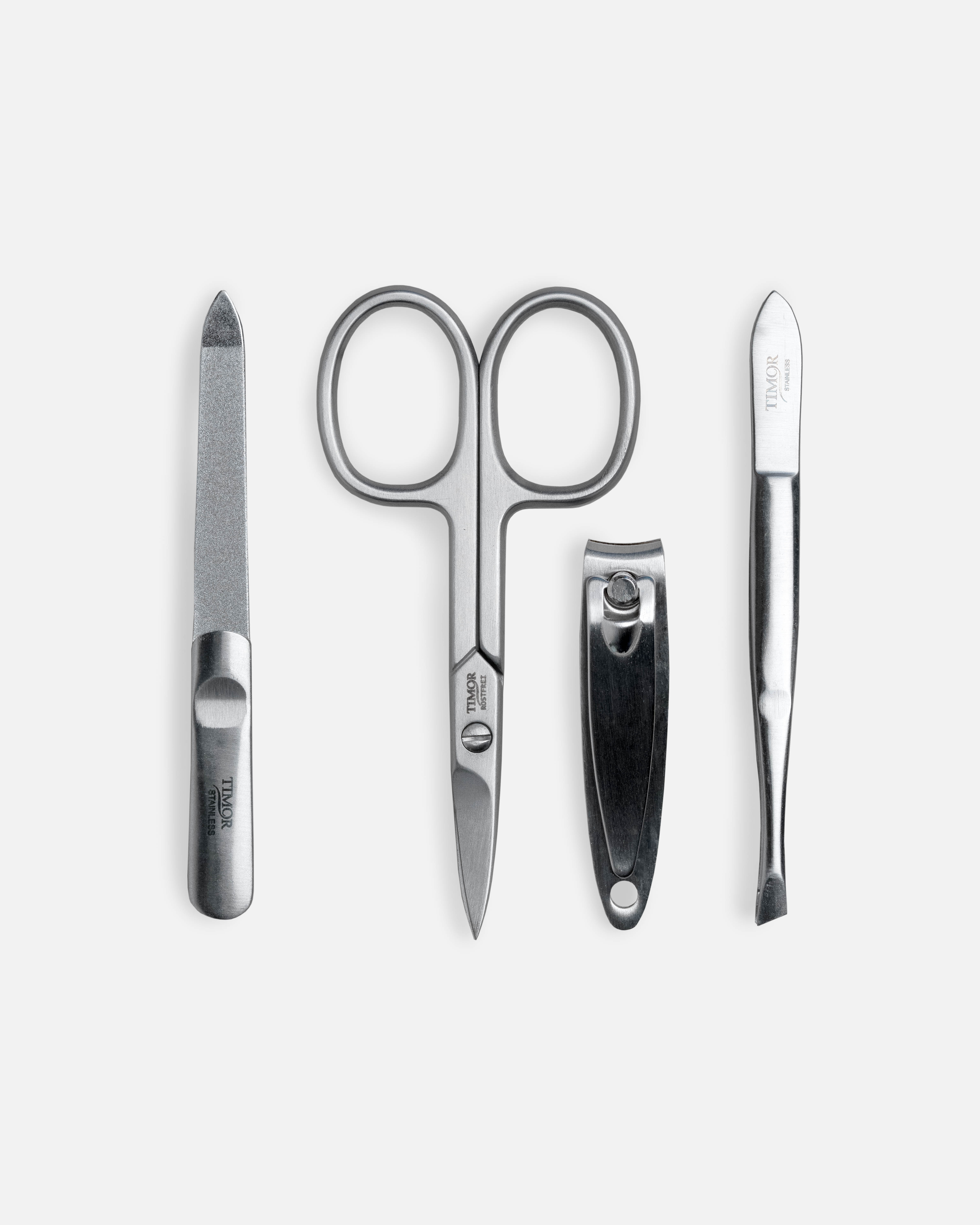 | Inhalt: | Kombinierte Haut-und Nagelschere, rostfrei, 95 mm Pinzette, rostfrei, 90 mm Nagelfeile, 90 mm Nagelknipser, 55 mm |