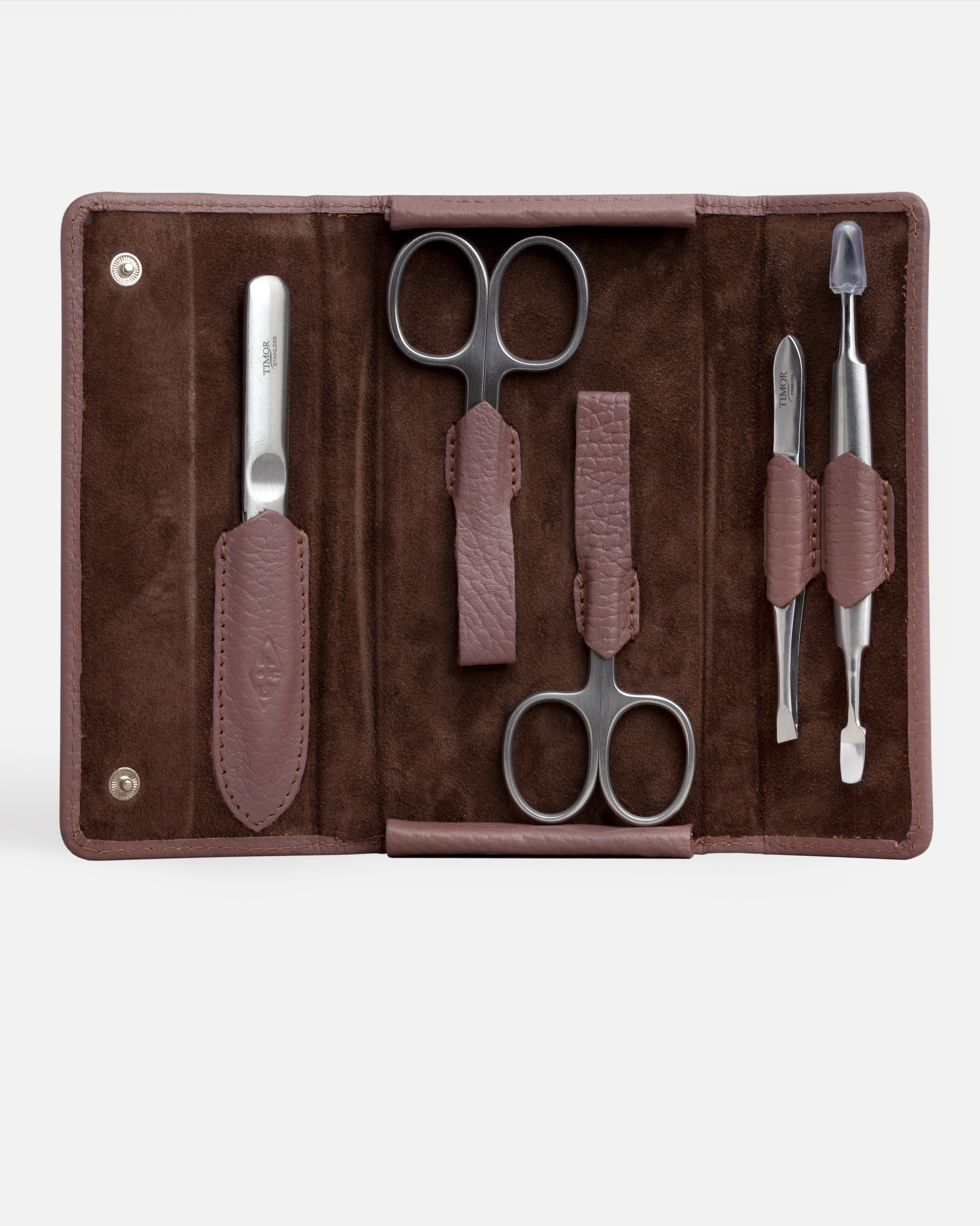 G&F Timor® 5-teiliges Manikürset aus besonders weichem, genarbtem Rindleder in pudrigem Mauve. Mit braunem Veloursleder-Innenfutter und zwei Druckknöpfen. Bestehend aus Haut- und Nagelschere, Pinzette, Manikürinstrument und Glas-Nagelfeile.