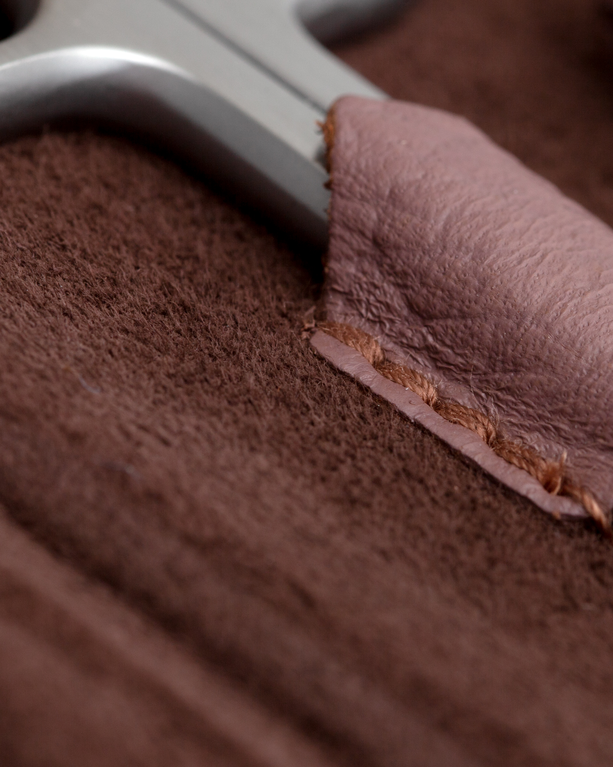 Das hochwertige Etui besteht aus echtem, durchgefärbtes Vollleder. Auf Kleber haben wir komplett verzichtet, alle Teile des Etuis sind stabil genäht. Das Etui färbt nicht ab und kann auch in Nassräumen verwendet werden. Die von uns ausgesuchte Materialkombination sorgt für einen strapazierfähigen und langlebigen Einsatz.