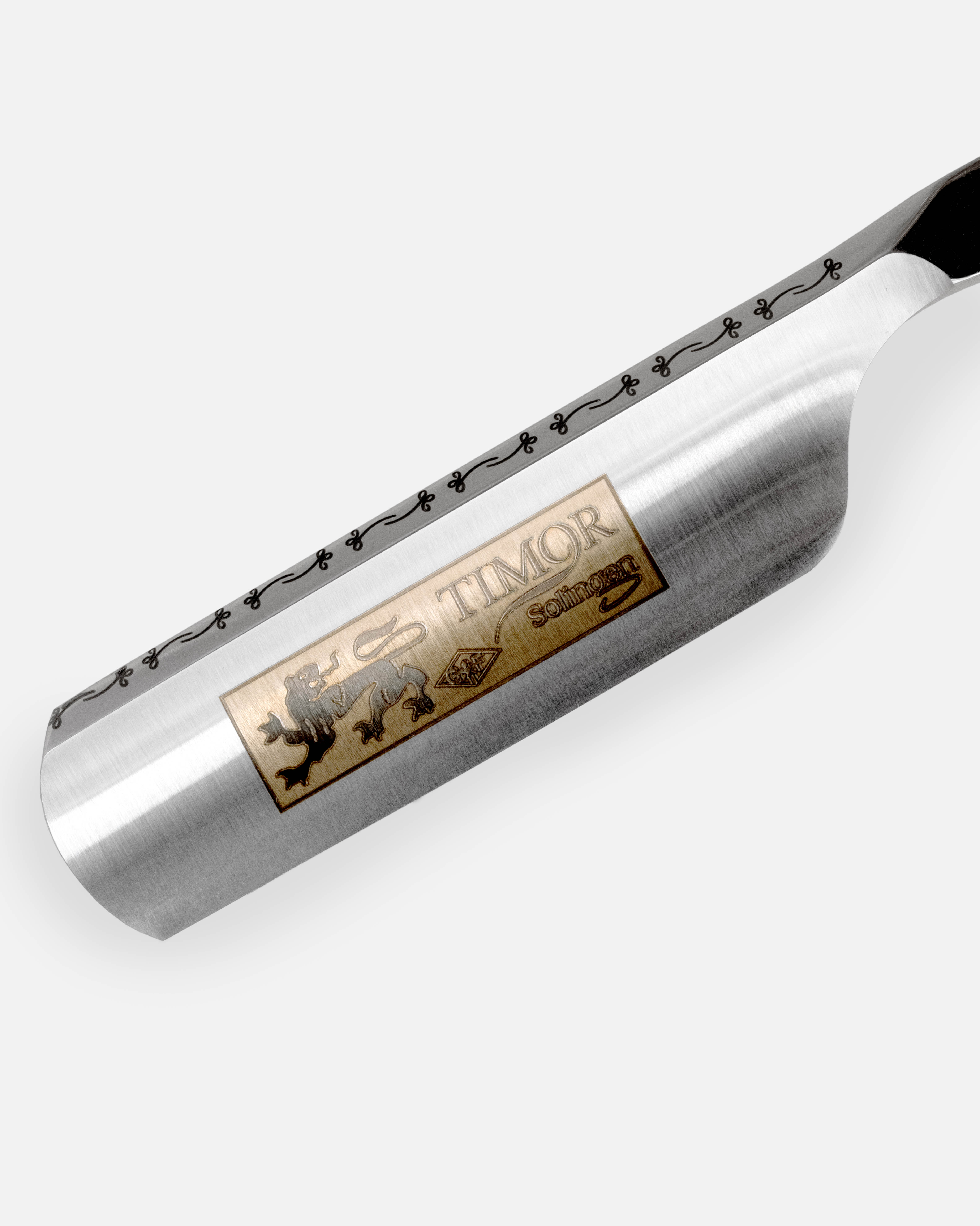 Handgefertigtes Rasiermesser mit Schale aus Marbleholz, nicht-rostfreier Carbonstahl in 6/8” Breite. Hohl geschliffene Klinge mit Goldlogo ‘Timor® Bergischer Löwe‘.