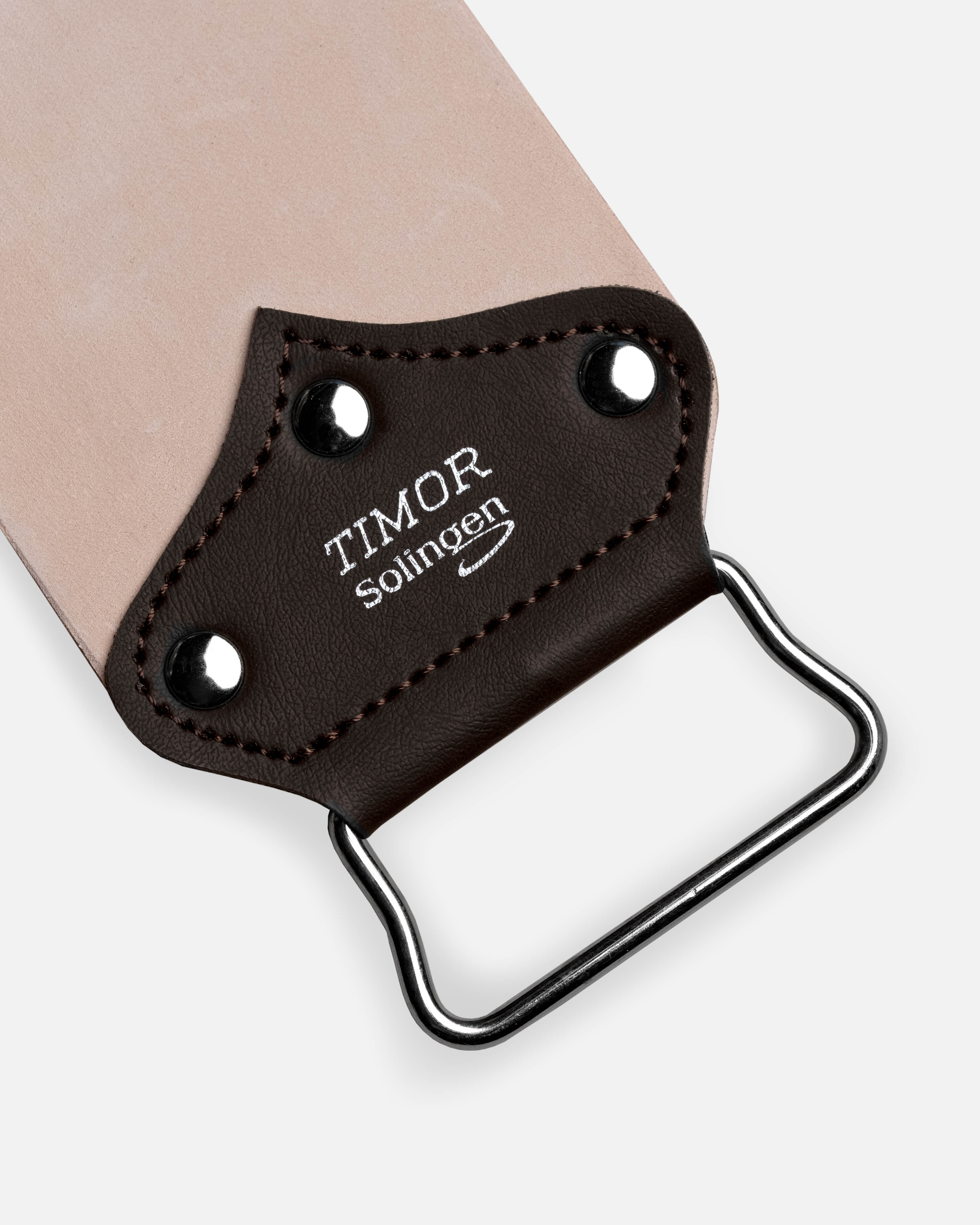 G&F Timor® Hängeriemen aus breitem Juchtenleder mit Haltegriff aus Metall. Gesamtlänge ca. 490 mm, Breite ca. 80 mm, lose verpackt, zum Nachschärfen von Rasiermessern aus Carbon- oder rostfreiem Stahl.