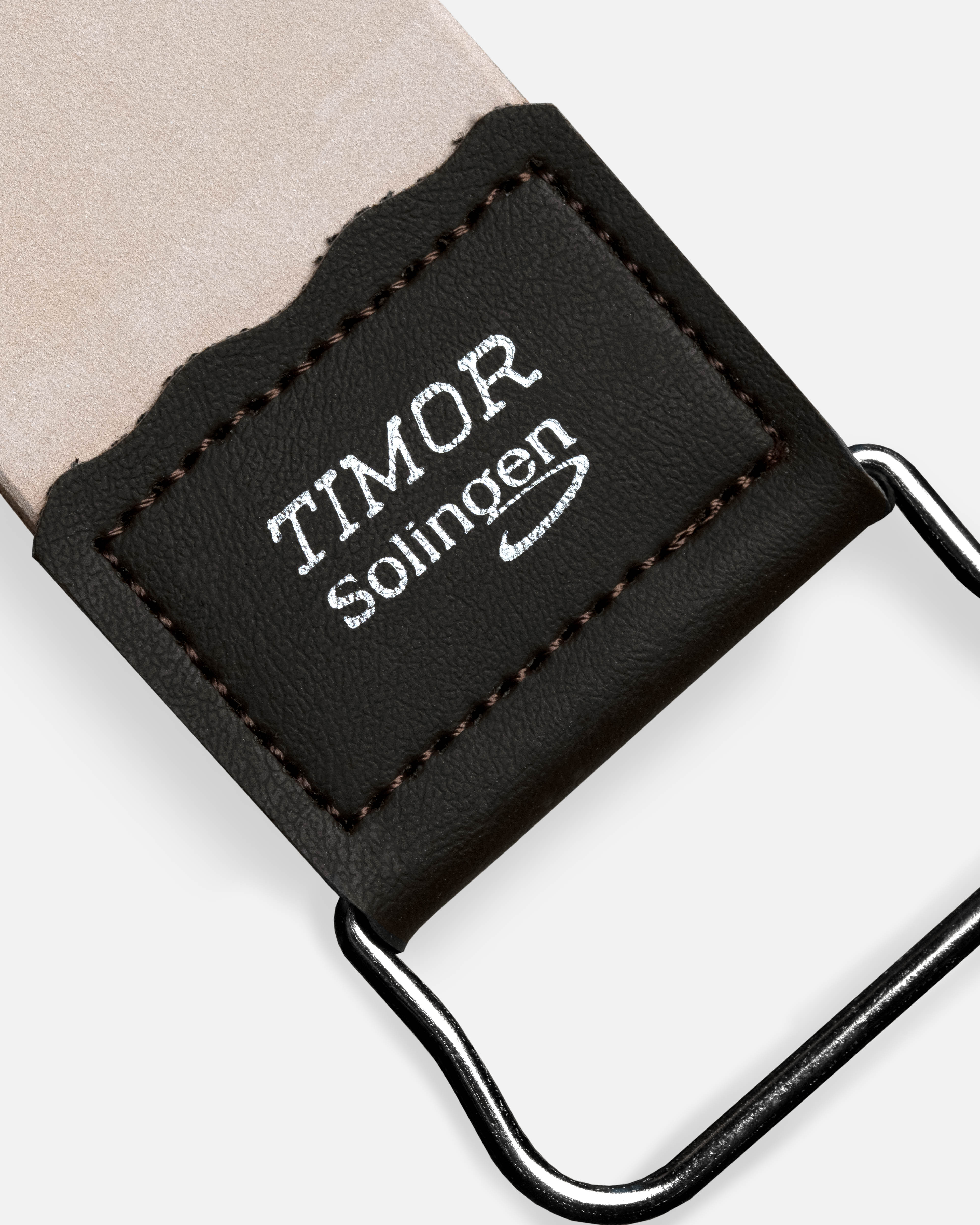 G&F Timor® Hängeriemen aus echtem Rindleder mit Gurt-Rückseite und Haltegriff aus Metall. Gesamtlänge ca. 490 mm, Breite ca. 45 mm, lose verpackt, zum Nachschärfen von Rasiermessern aus Carbon- oder rostfreiem Stahl.