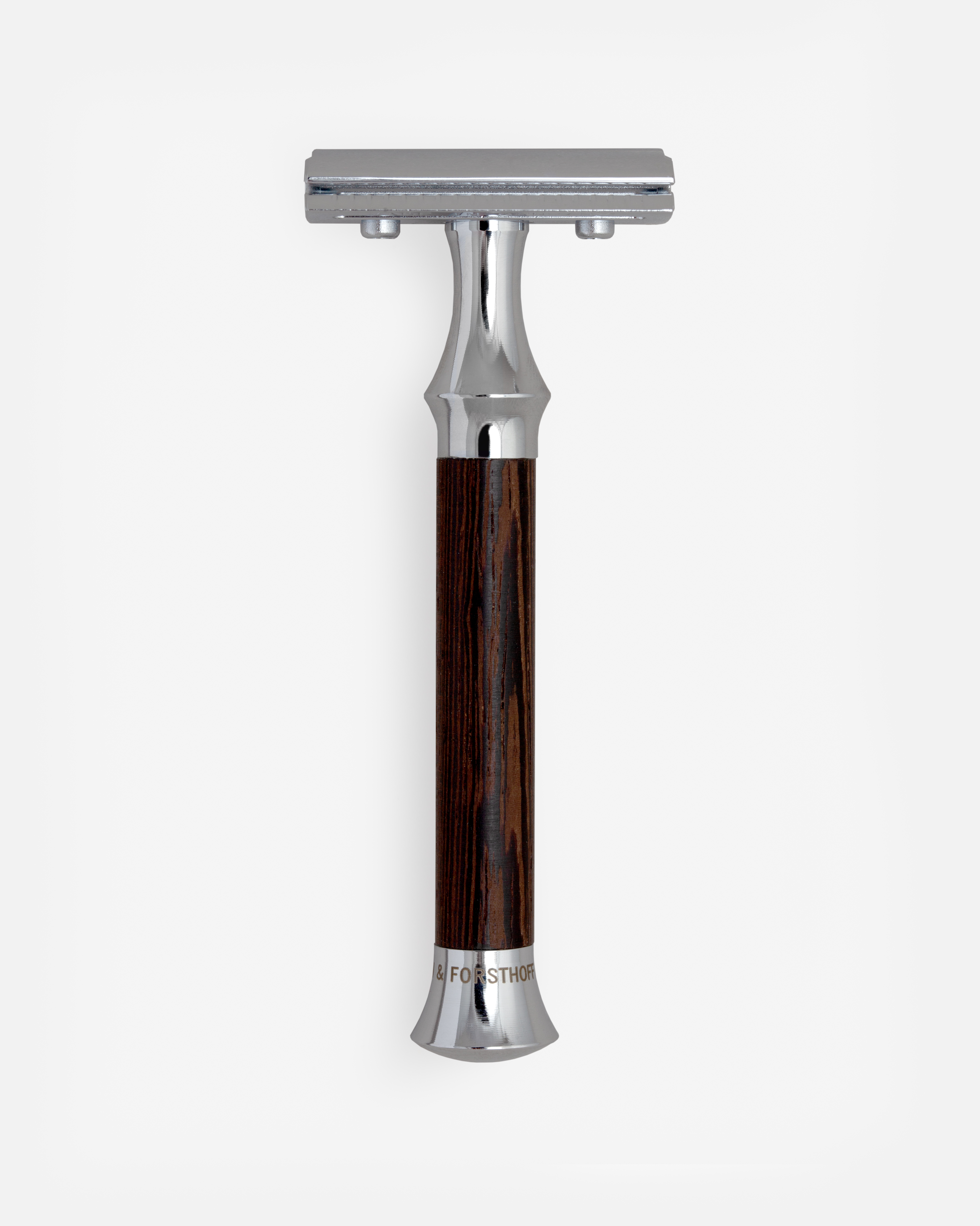 Klassischer, 3-teiliger Rasierhobel der Kollektion 1920 mit Griff aus massivem, verchromten Messing mit Zwischenstück aus echtem Wengeholz, in 100 mm Länge. Inklusive 10 Timor® Rasierklingen.