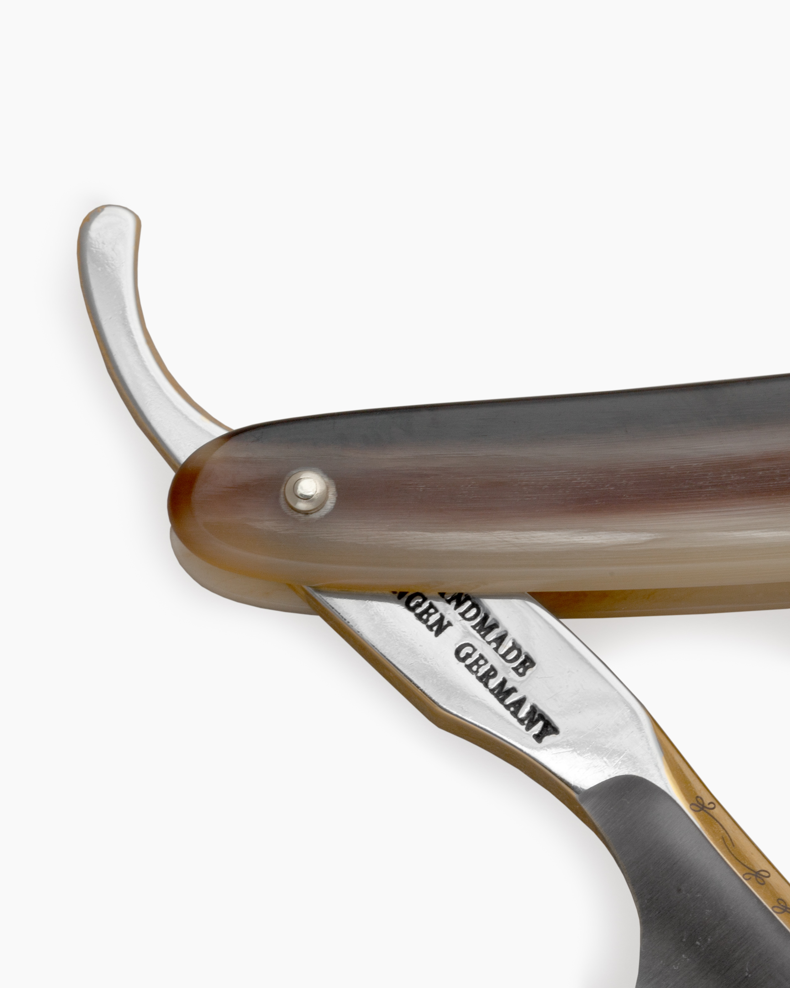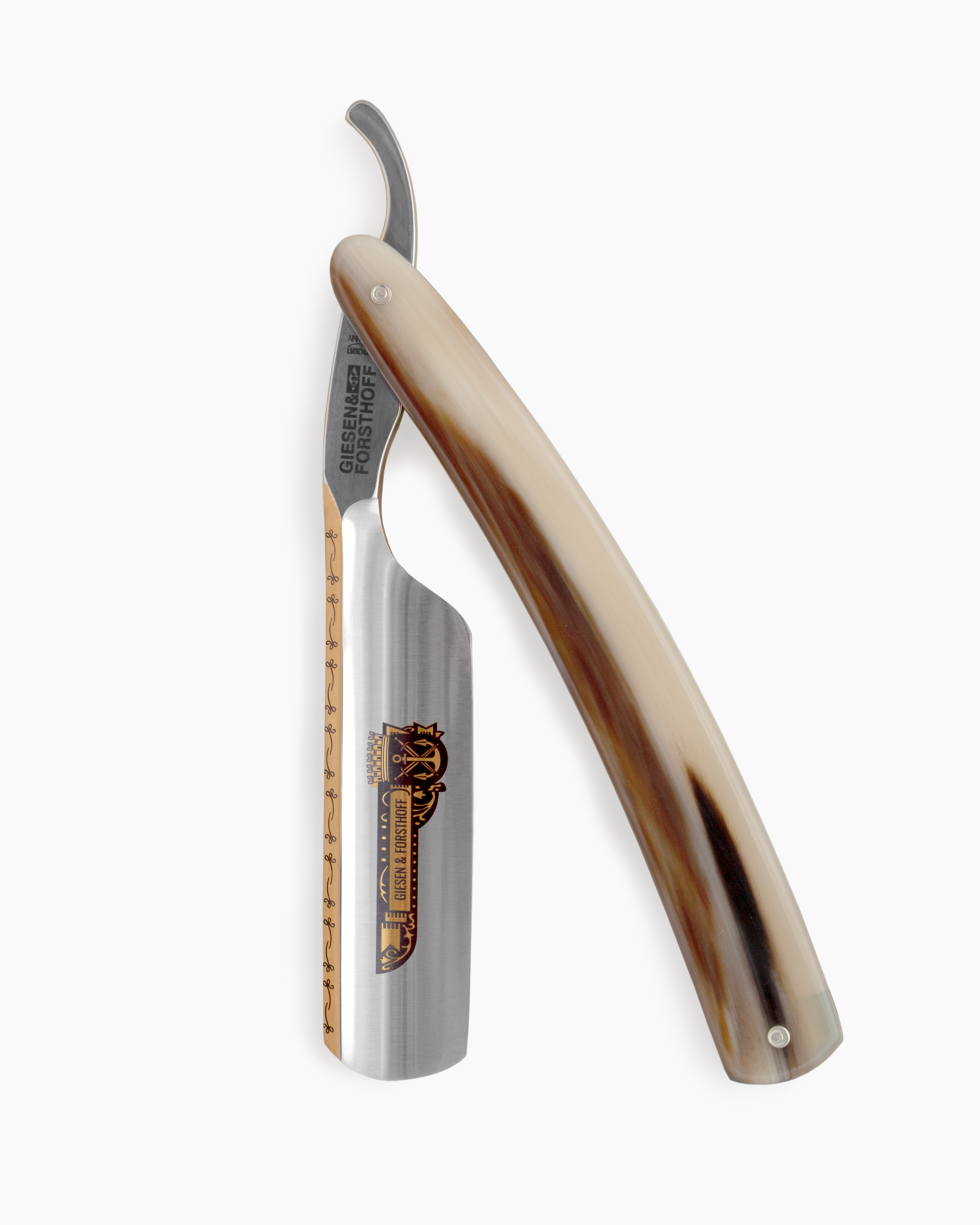 G&F Timor® Handgefertigtes Rasiermesser mit echter Hornschale, nicht-rostfreier Carbonstahl in 6/8” Breite. Hohl geschliffene Klinge mit Goldlogo ‘Solingen Wappen‘, hand-vergoldeter Rücken.