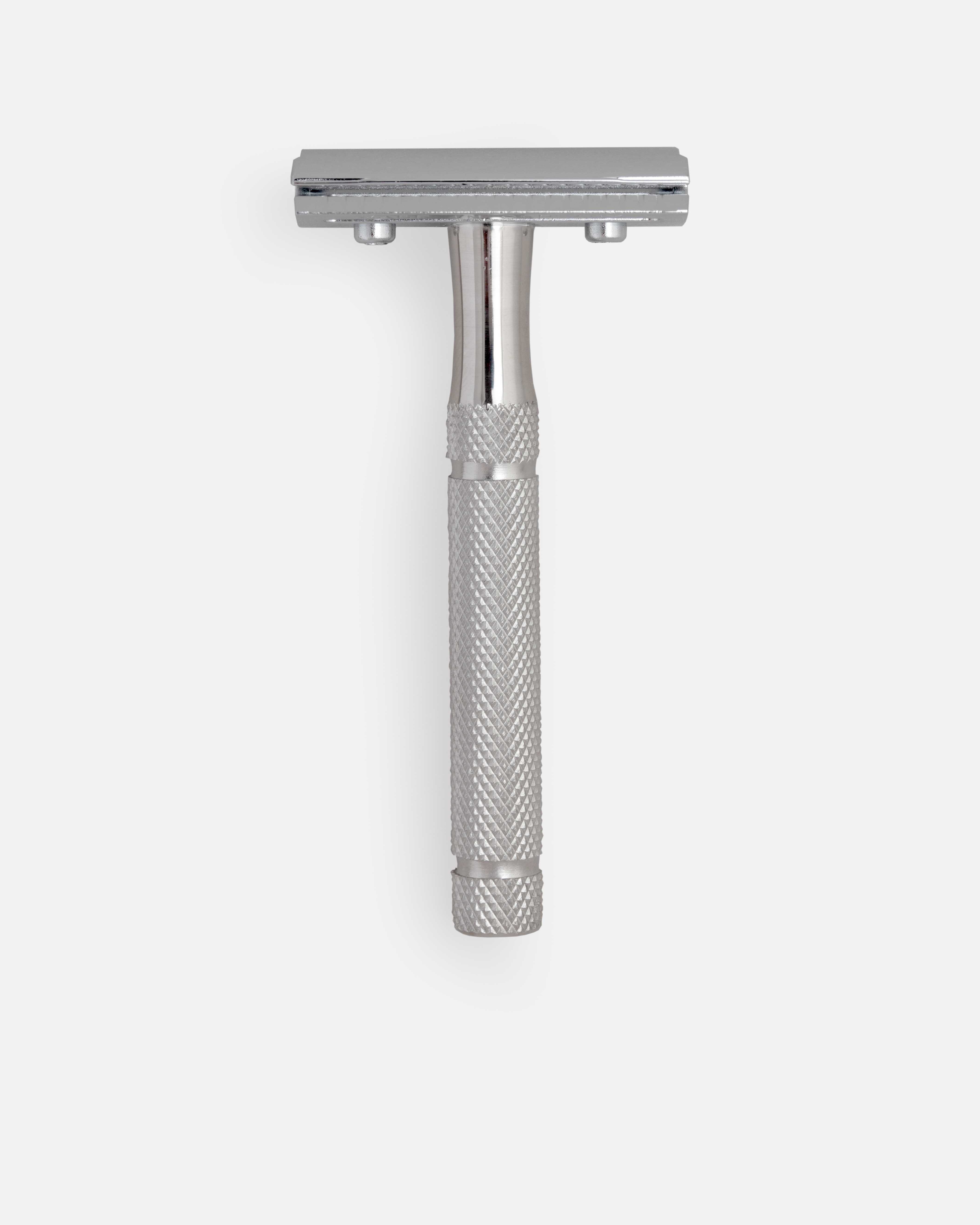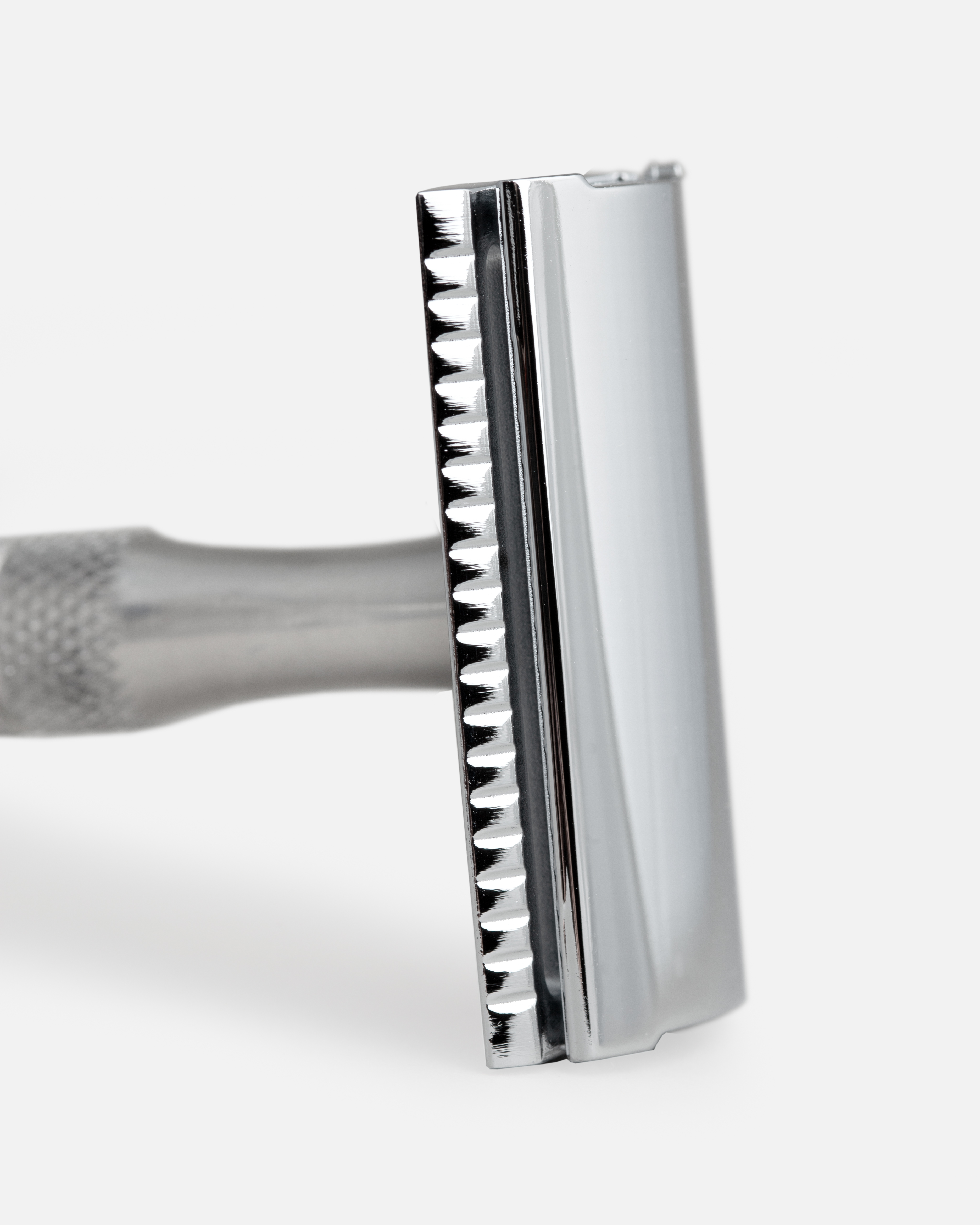 Klassischer, 3-teiliger Rasierhobel der Unisex Kollektion Gentle Shaver mit Griff aus massivem Edelstahl in 80 mm Länge, mit Ziselierung für besonders sichere Handhabung. Inklusive 1 Timor® Rasierklinge.