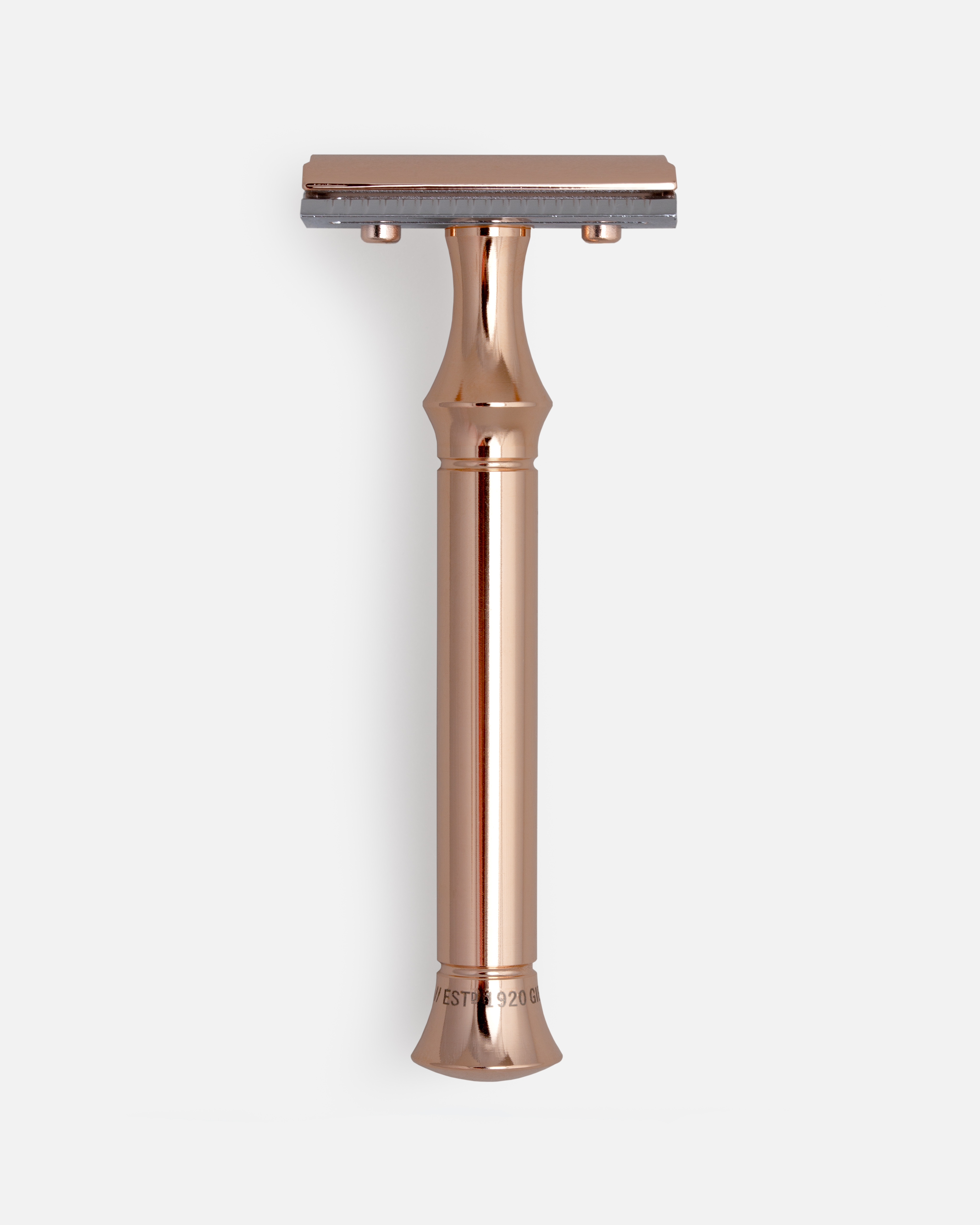 3-teiliger Sicherheitsrasierer ZÓE Classic Edition Bicolor mit rosévergoldetem Griff aus massivem Edelstahl in 100 mm Länge. Inklusive 10 ZÓE Rasierklingen.